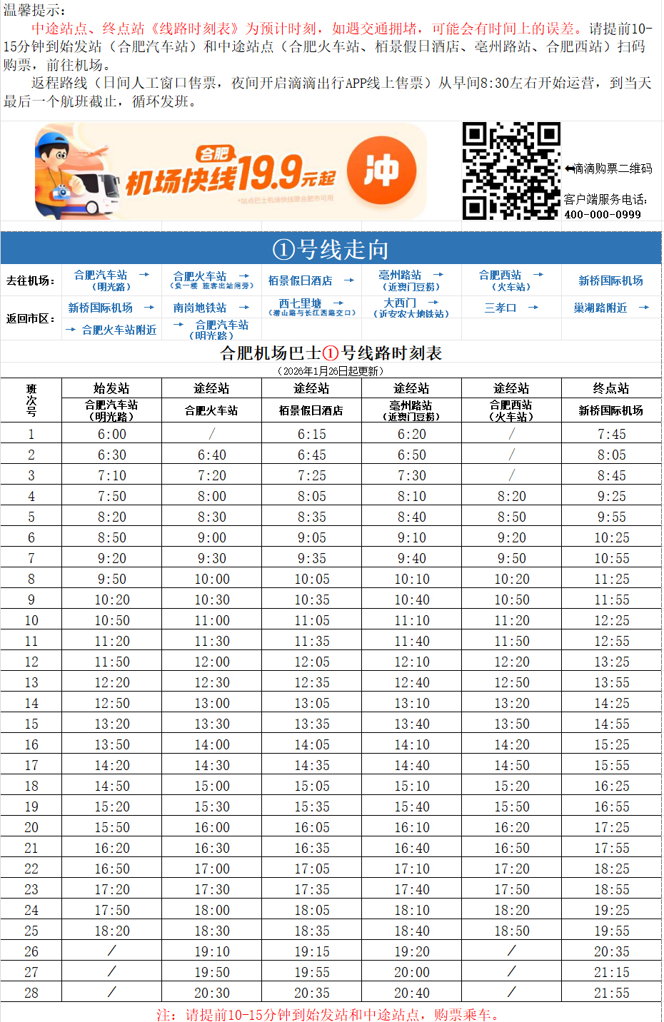 去往机场 合肥汽车站(明光路) 合肥火车站 栢景假日酒店 亳州路站(近澳门豆捞) 合肥西站(火车站) 新桥国际机场 返回市区 新桥国际机场 南岗地铁站 西七里塘 大西门(近安农大地铁站)三孝口 巢湖路附近 合肥火车站附近 合肥汽车站(明光路) 线路时刻表